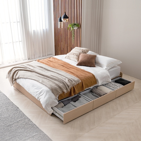 벽쪽은 매트리스를 풀고 뚜껑을 열어 수납할 수 있는 벙커 수납공간으로, 벽 반대편은 서랍 3개로 제작했습니다. 무헤드 프레임이므로 나중에 다른 방으로 이동할 때 방향이 바뀌어도 전혀 지장이 없습니다.수납공간이 필요하지 않다면 가죽이나 패브릭 통신판매형으로도 세로 길이가 짧은 무헤드 프레임 제작이 가능합니다.^^
